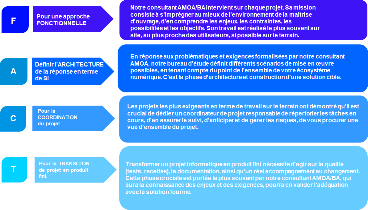 Pour garantir le bon déroulement des missions qui nous sont confiées, nous avons développé le modèle d’organisation FACT, quatre rôles indissociables d’une réussite projet.